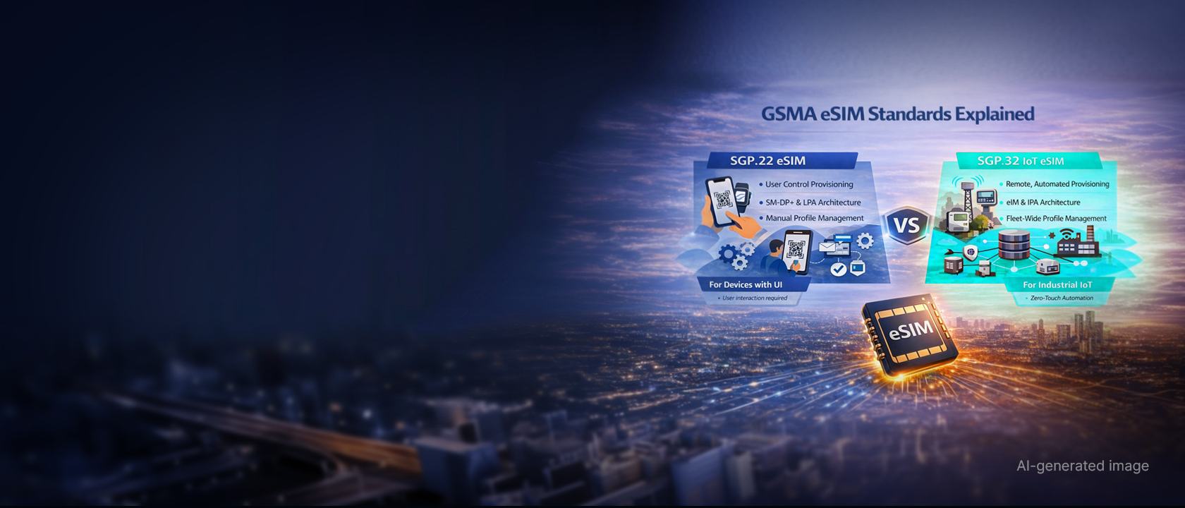 | GSMA standard | SGP.22 – eSIM architecture. | SGP.32 – Exclusive IoT eSIM architecture. |