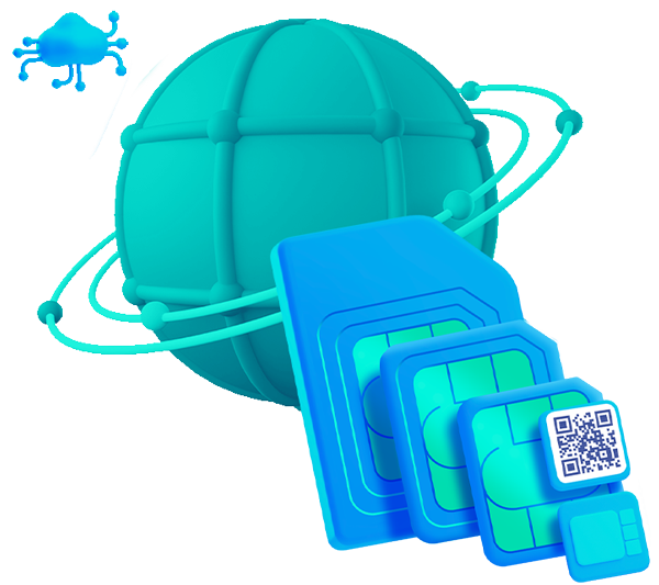 SIM in mehreren Formfaktoren, einschließlich eSIM-Lösungen gemäß den Standards SGP.22 und SGP.32, basierend auf eUICC-Technologie für Remote Provisioning und Aktivierung per QR-Code.