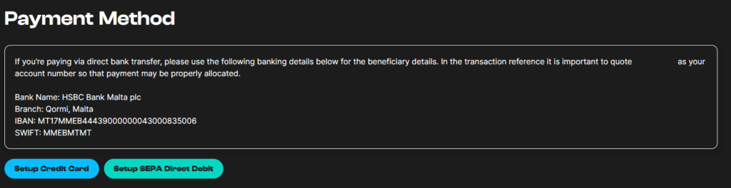 Once you access the modify section, you will be prompted to set up a payment method, either by credit card or SEPA direct debit.