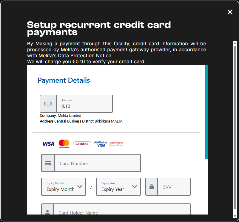 Choose this payment method to pay your bills instantly and securely. Once you add your credit card details, you have the option to set up a PACC recurring pre-authorised payment method. All credit card information will be processed by Melita’s authorised secure payment gateway provider in accordance with Melita’s Data Protection Notice.