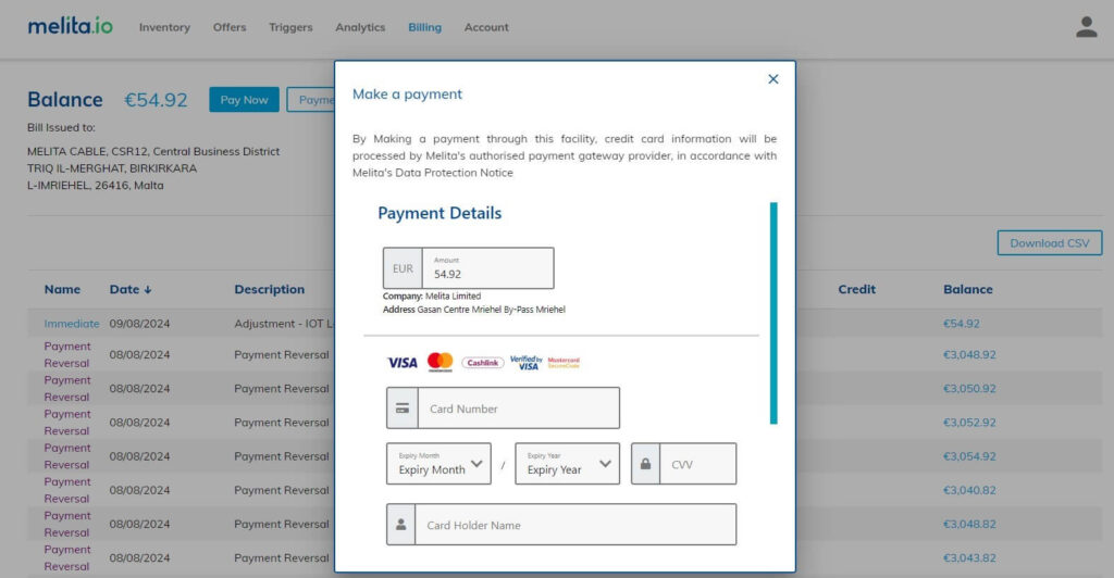 Choose this payment method to pay your bills instantly and securely. Once you add your credit card details, you have the option to set up a PACC recurring pre-authorised payment method. All credit card information will be processed by Melita’s authorised secure payment gateway provider in accordance with Melita’s Data Protection Notice.