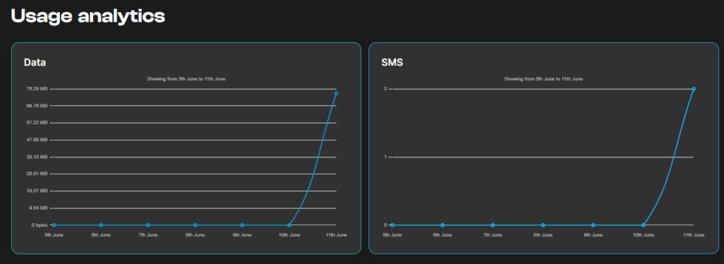Upon entering the Analytics screen, you will find two graphs displaying Data usage and SMS usage at the Offer level over time.