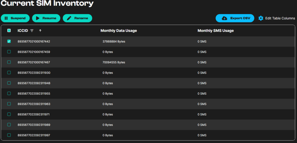 You may also view the same information as a trend in the Analytics section. Here the focus is on viewing usage over a period so you can monitor trends and any abnormal behaviour. You may also zoom further on specific days, periods, or SIMs. The lowest level is the individual SIM level. This may be tracked from the Analytics page or by selecting the specific SIM in the SIM inventory page.