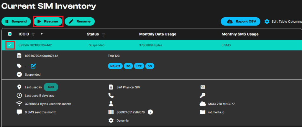 To resume a SIM that has been temporarily suspended you can do so by accessing the portal. You may do this on both an individual SIM level and a group of SIMs.