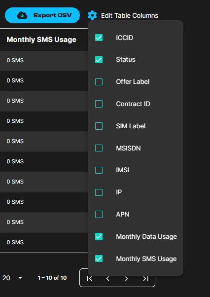 By default, the SIM Inventory page will show a selected number of fields / headers for all your SIMs including unique identifiers such as ICCID, MSISDN and IMSI. You may at any point in time add or remove headers from the available list in line with your preferences. To do so simply click the cog wheel button on top-right of the inventory table, also labelled “edit table columns”. This will display a list of fields currently active and fields that may be added. Simply tick the ones you want to see and tick-off the ones you do not wish to see anymore. The table will automatically refresh showing only information for the desired columns.