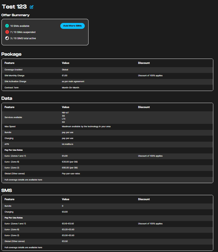 An Offer is a group of SIM cards. All SIM cards in an Offer have the same service benefits such as the same connectivity service, same price, and may share from the same data or SMS bundle. You can consider this as a project and may assign a different name for every Offer. As your project grows you can add more SIMs to the same Offer and they automatically benefit from the same conditions. Pricing is also applied at Offer level hence when adding SIM cards, you know already the pricing conditions of the new SIM cards in the same offer.
